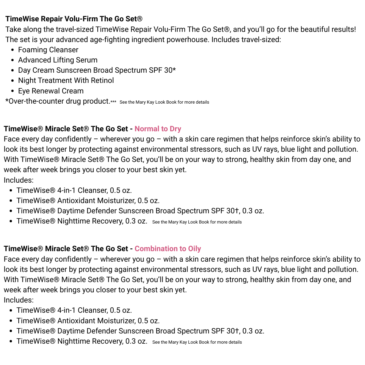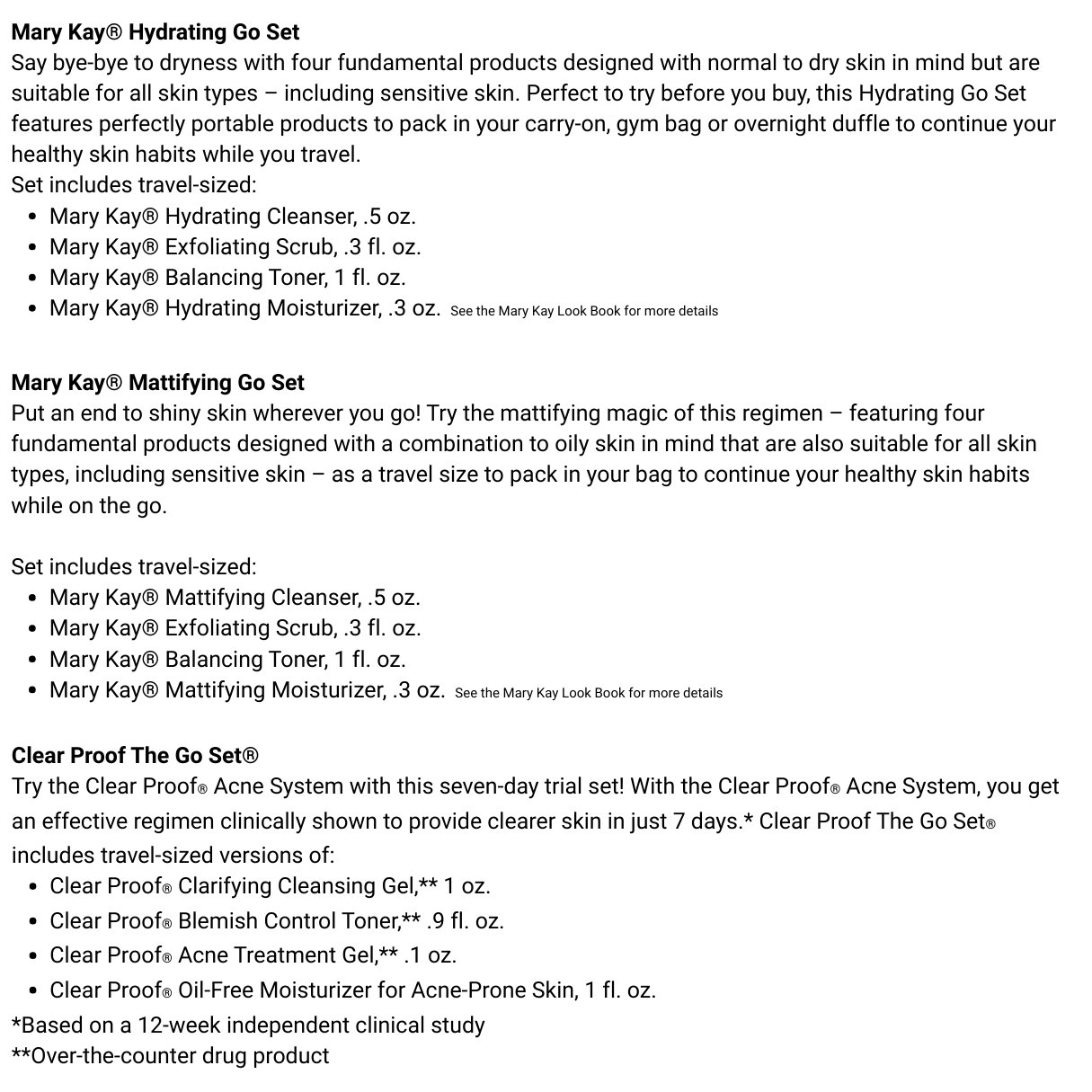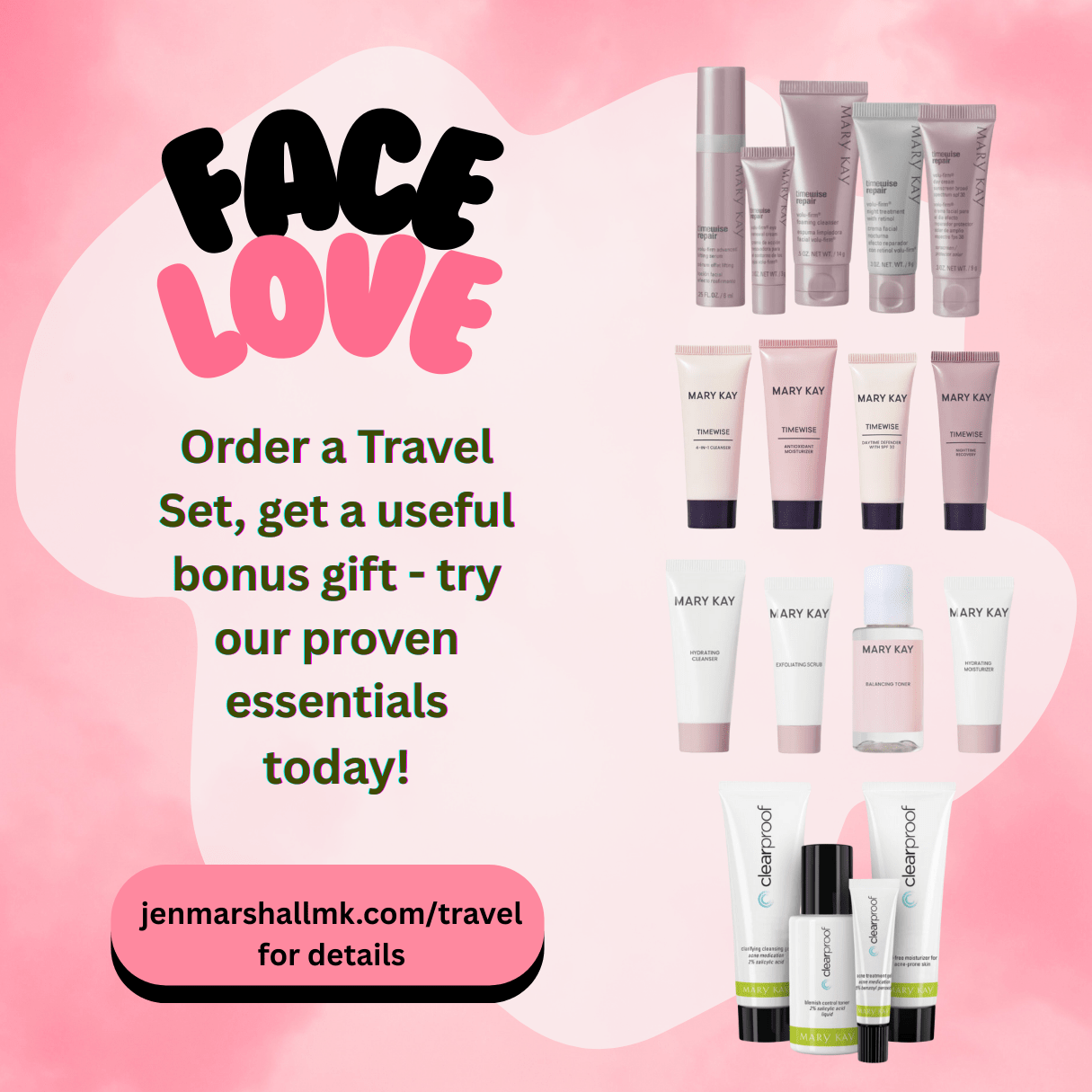 Welcome to JenMarshallMK. If you do not have a Mary Kay Consultant, I would love the opportunity to earn your business. These To-Go travel sets are, in my opinion, the best way to try our skin care lines. For a limited time, I am offering the set that best fits your needs along with a bonus gift: a full-size mascara that I think you will find that you love. Feel free to contact me with any questions and, as always, be kind to yourself. JM